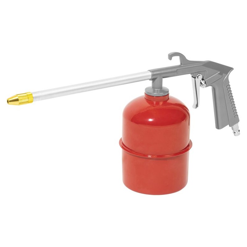 Striekacia pištoľ s rukoväťou a ventilom z tlakovo liateho hliníka, na striekanie čistiacich prostriedkov, tekutého vosku, aerosolového oleja a podobne, prípojná vsuvka.